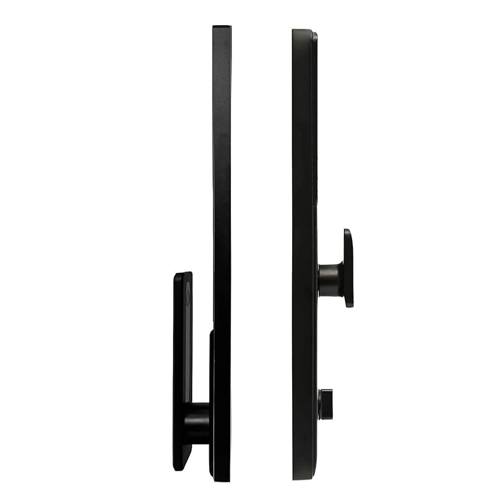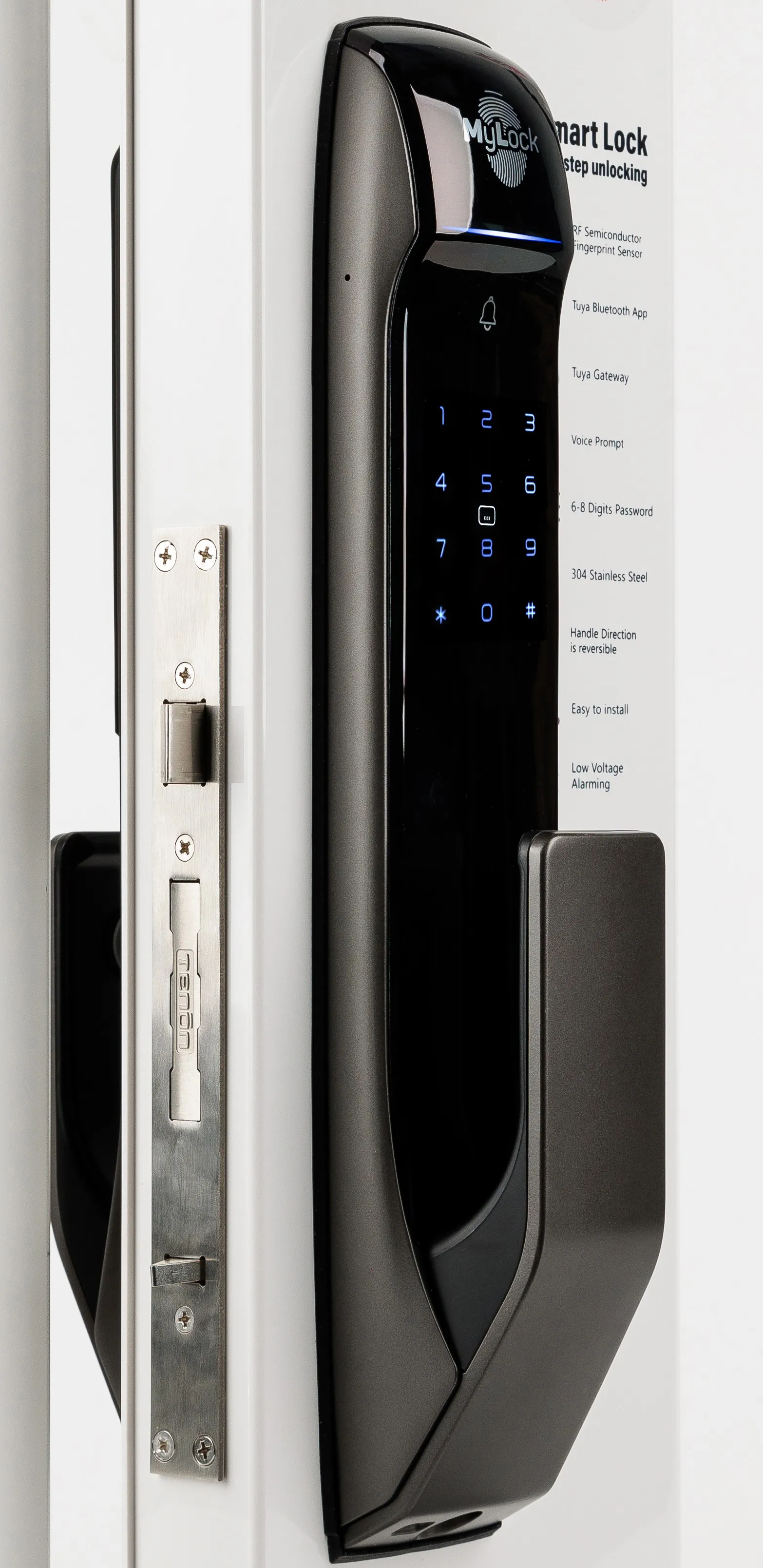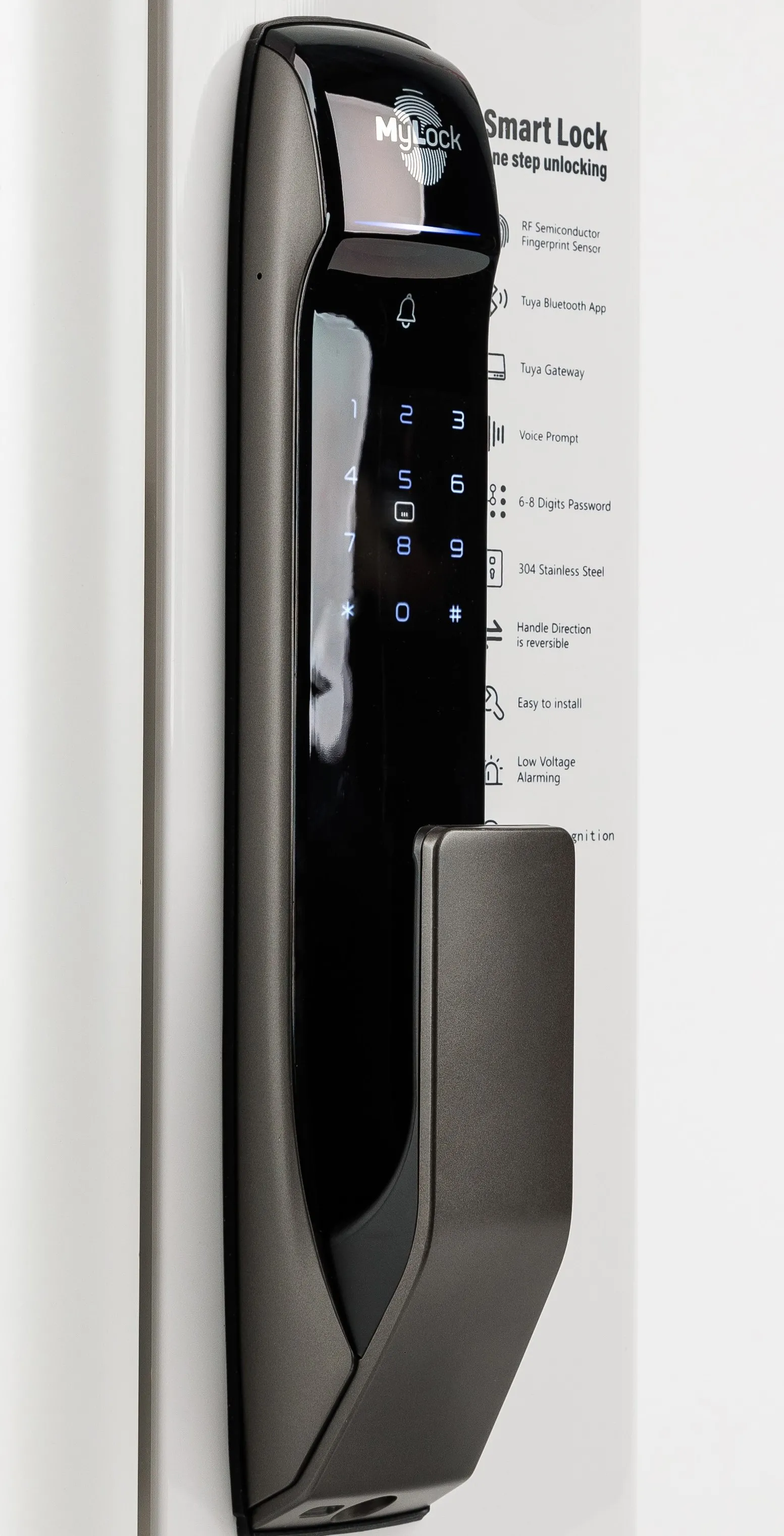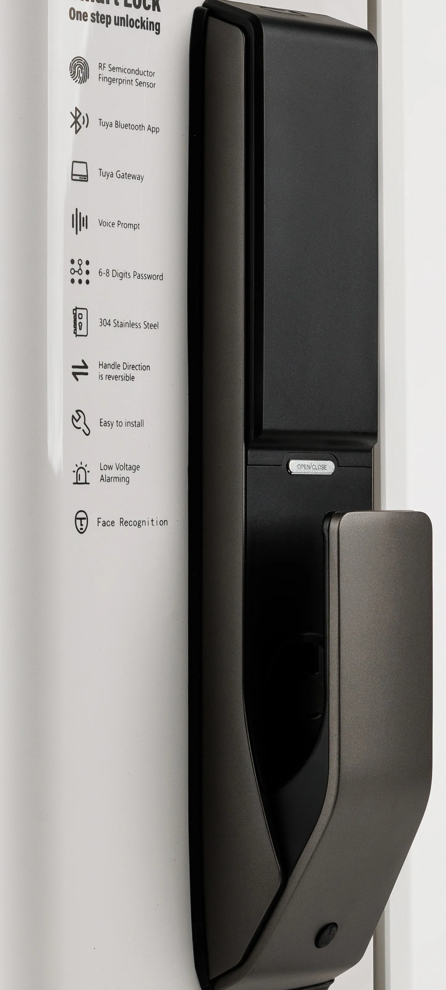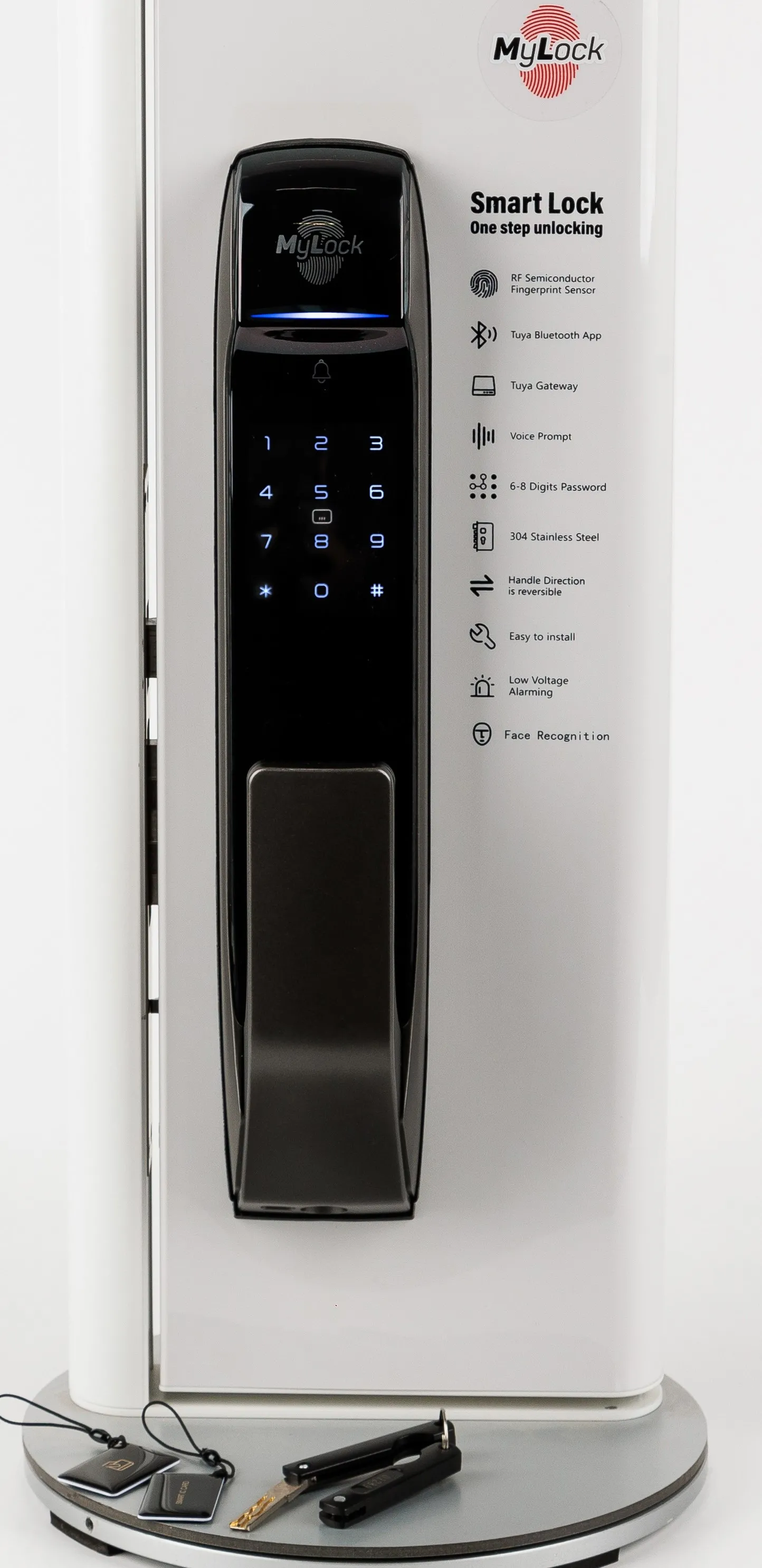 Обладает современным лаконичным дизайном, четкими линиями и гармонично вписывается в дизайн двери. Внешняя алюминиевая ручка-штанга с PVD покрытием (не выцветает 20 лет) и имеет дополнительную защиту от влаги. Внутренняя ручка выполнена из фрезерованного алюминия, замок из нержавейки с круглыми ригелями. Есть приложение для IOS и Android - Smart Life (Tuya). Взаимодействие с умным домом: Яндекс Алиса, Google Home и Alexa.