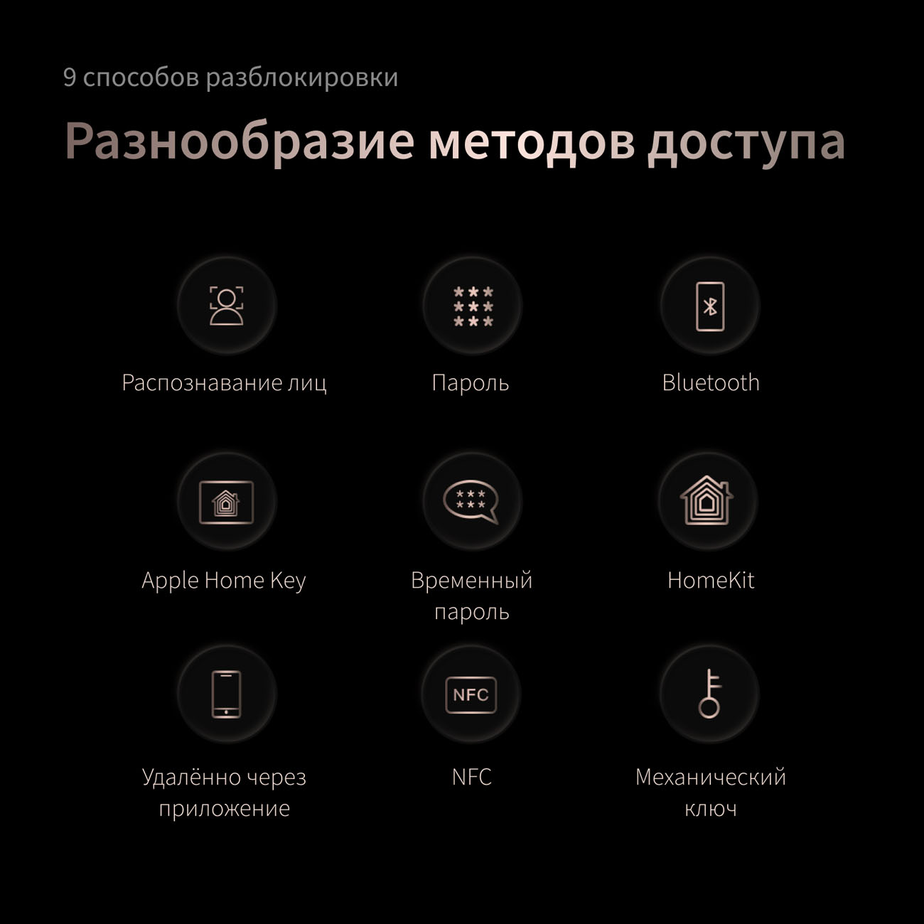 Способ разблокировки:Распознавание лица, пароли, временные пароли, Bluetooth, NFC, механический ключ, HomeKit.