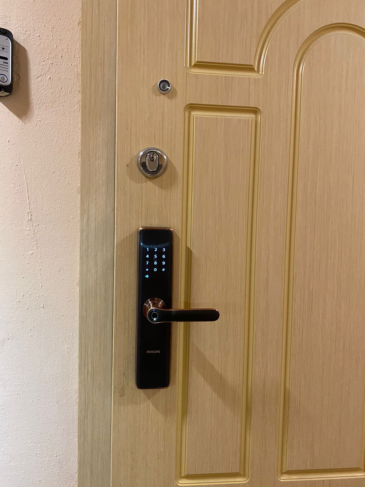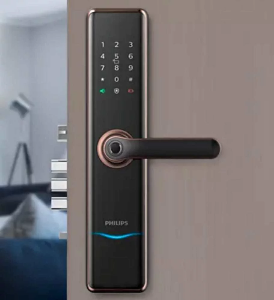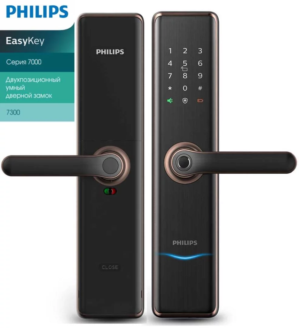 Умный цифровой замок Philips Easykey 7300 для домов, офисов и квартир. Современный дизайн. Эргономичная ручка. Водонепроницаемый. Высшая степень секретности. Быстрое и удобное запирание/открывание дверей в одно касание с помощью электрического замка Philips Easykey 7300. Питание электронного смарт замка от обычных пальчиковых батареек АА. О состоянии заряда батареек замок оповещает (на смартфон, индикатор на панели замка, звуковой сигал) В экстренном случае, если батарейки разрядились можно воспользоваться power bank с внешней стороны двери.