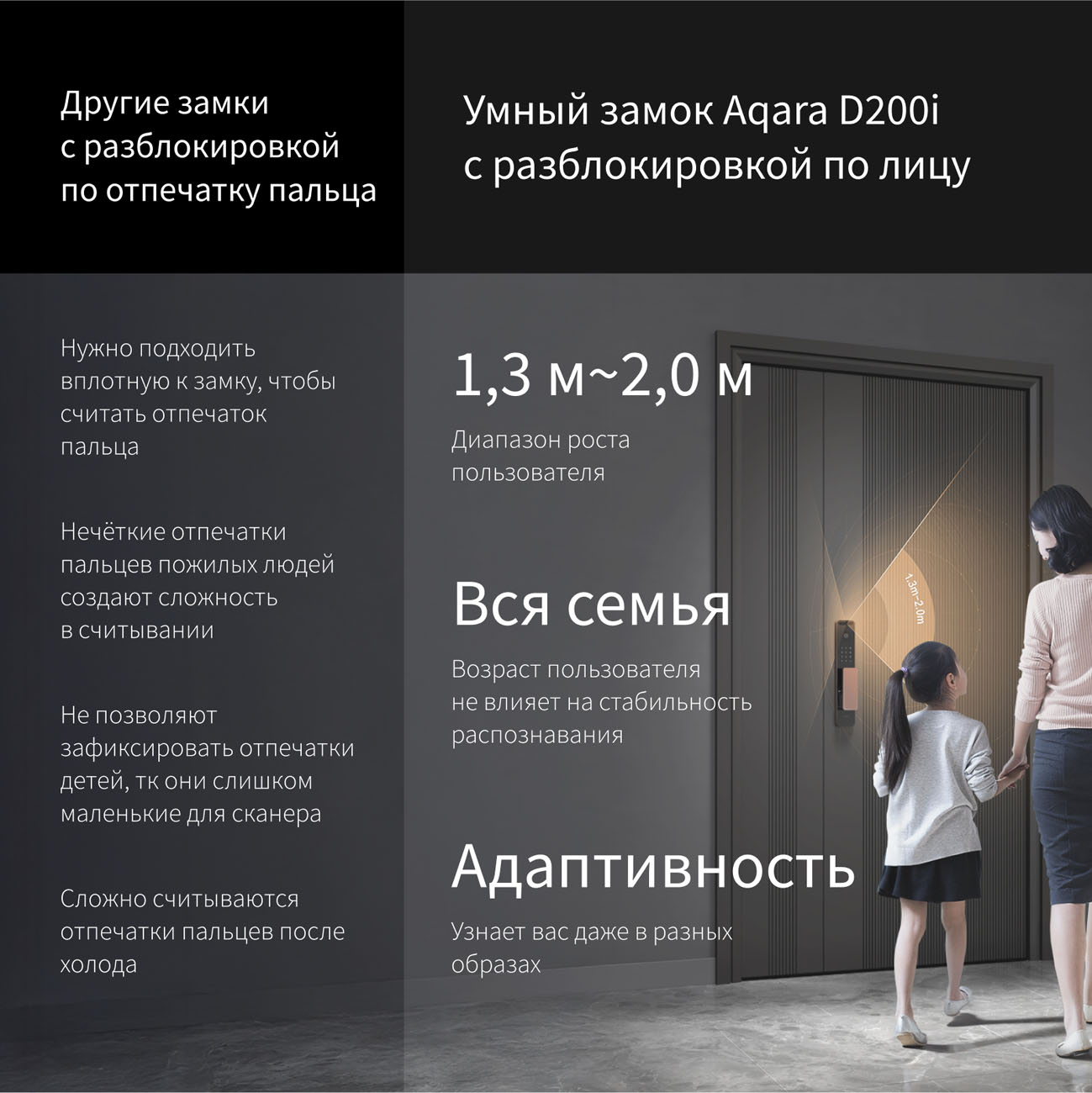 Aqara Smart Lock D200i — флагманский умный дверной замок, оснащенный передовой технологией 3D-распознавания лиц и автоматическим механизмом запирания. Он поддерживает Apple Home Key и различные методы разблокировки, включая PIN-коды, NFC-карты и традиционные механические ключи.