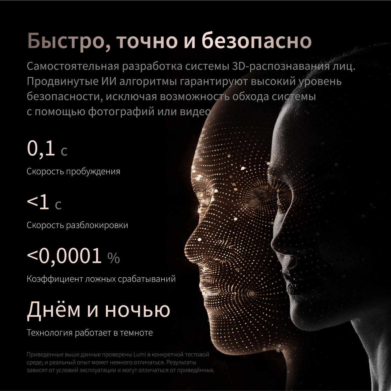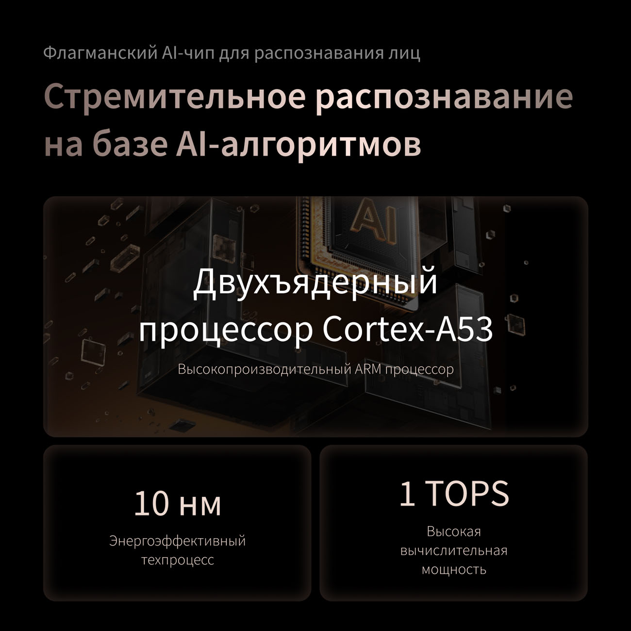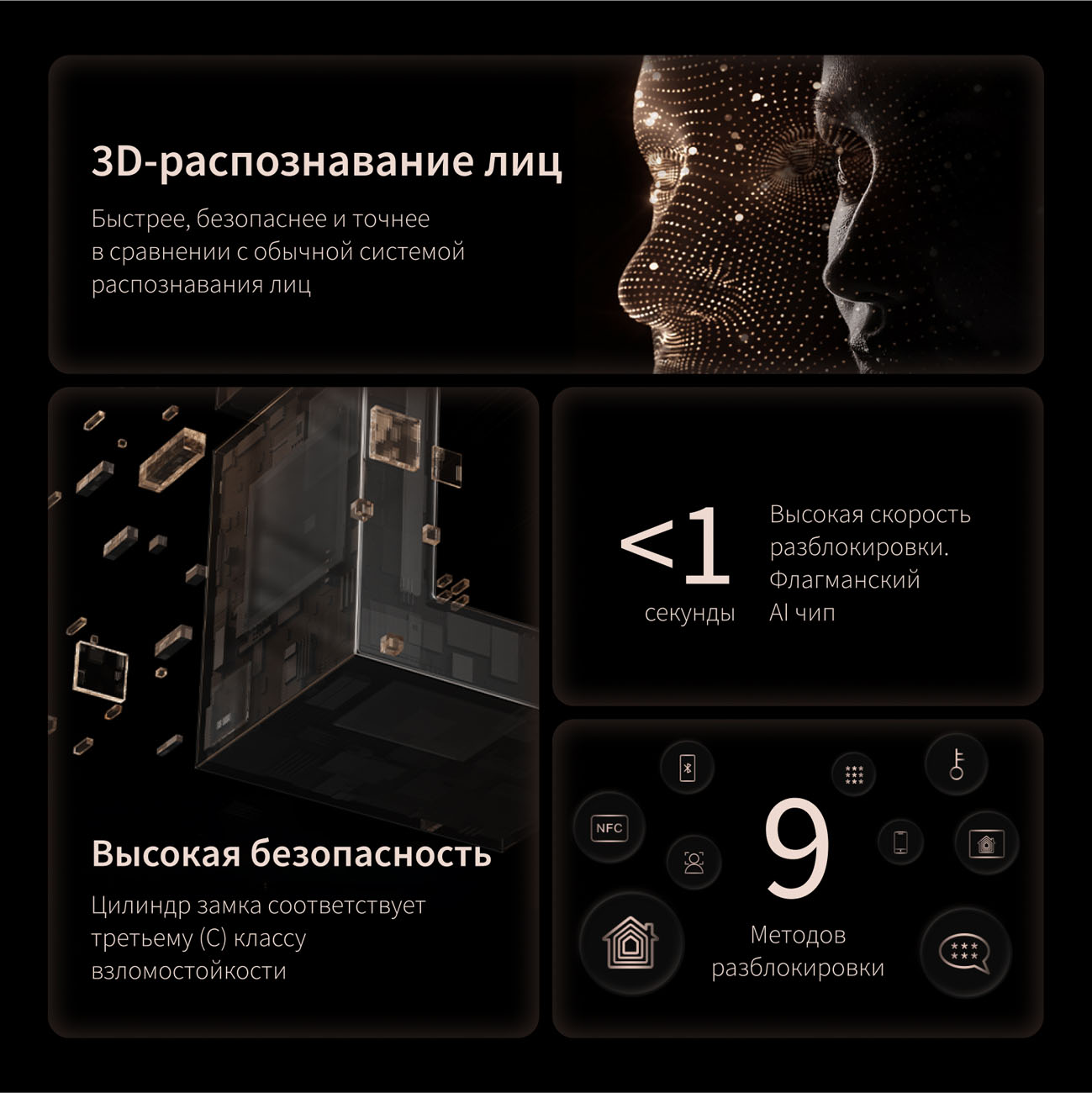 - 3D-распознавание лиц: Быстрое и точное разблокирование дверей благодаря высокоточному моделированию лица и встроенному ИИ-чипу. Продвинутые алгоритмы гарантируют высокий уровень безопасности, исключая возможность обхода системы с помощью фотографий или видео.