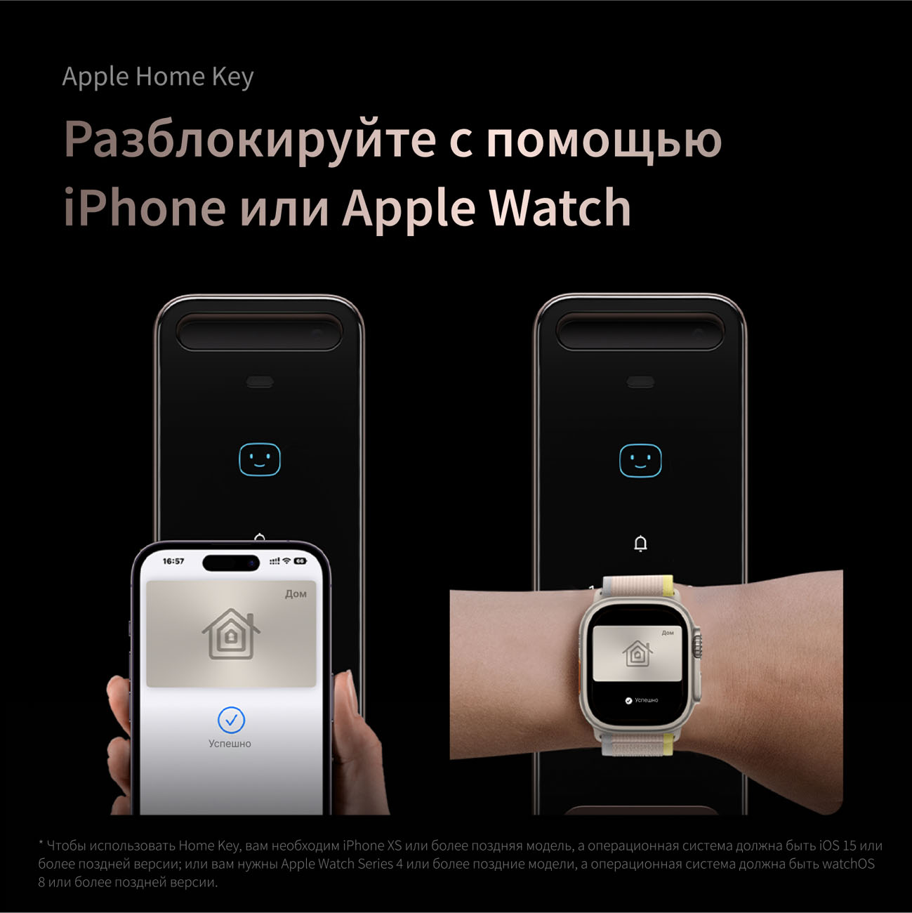 - Поддержка Apple Home Key: Интеграция с Apple HomeKit позволяет использовать iPhone или Apple Watch в качестве цифрового ключа для разблокировки двери.
