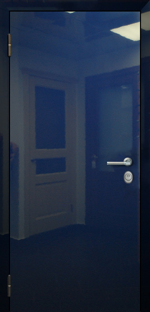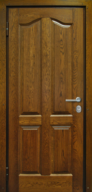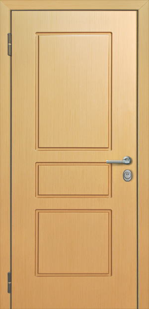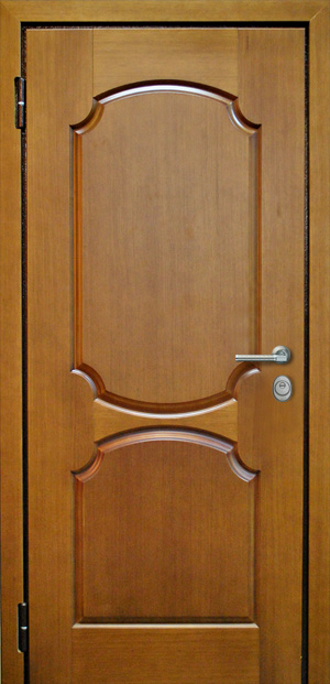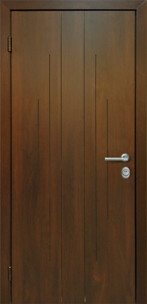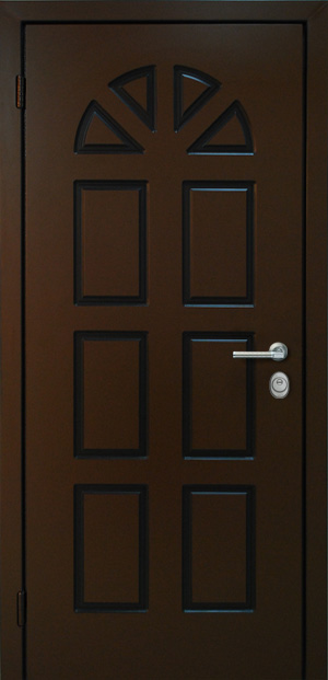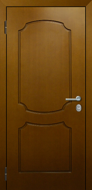 Рама из гнутого профиля 2мм с притвором и наличником, дверное полотно толщиной 50мм из листа металла 2,5мм (с внешней стороны) c каркасом из гнутого профиля. 2 вертикальных ребра жесткости и 8 горизонтальных. Шумоизоляция до 40дБ.